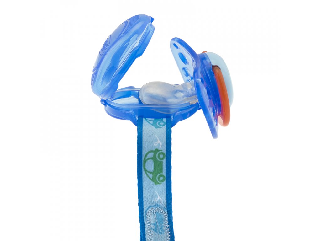Řetízek na dudlík s klipem a praktickým krytem na dudlík v případě, že ho dítě nepoužívá.