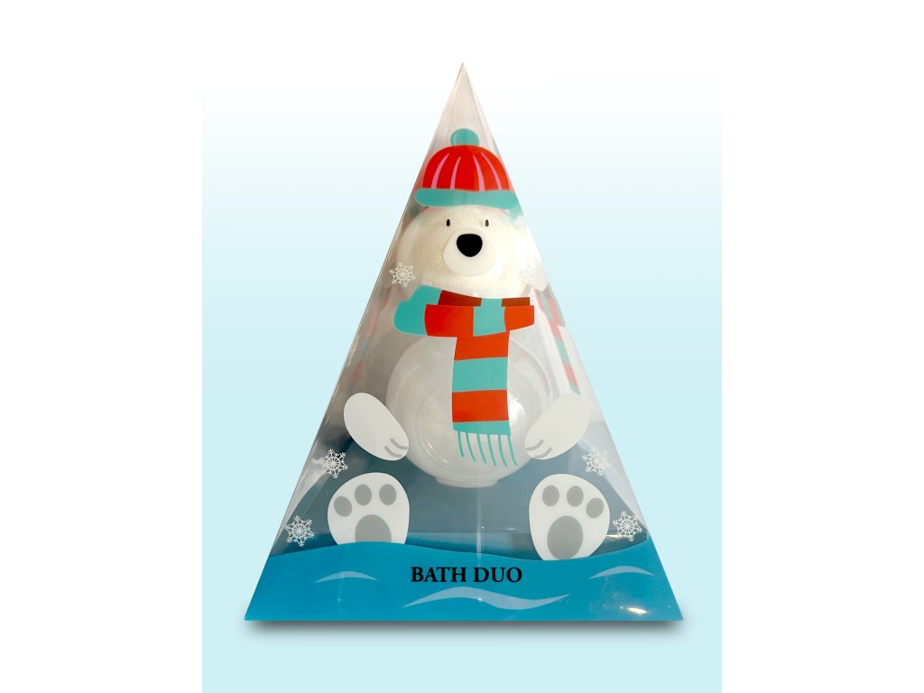 Šumivá koule do koupele a pěna do koupele v krabičce s motivem ledního medvěda.