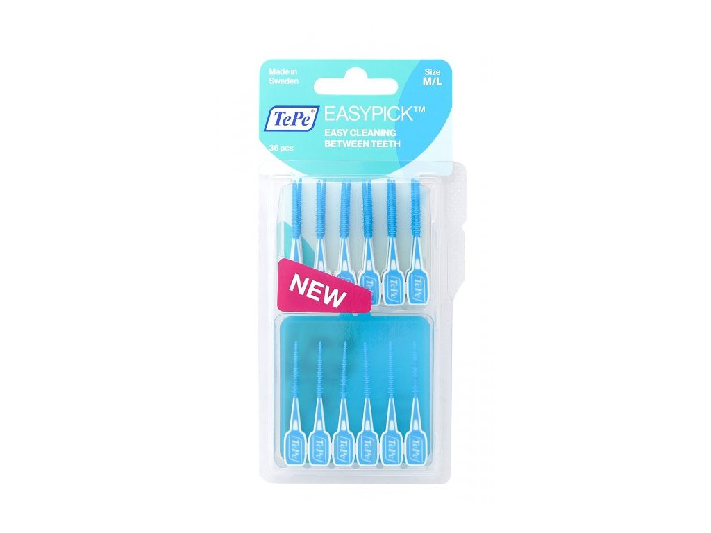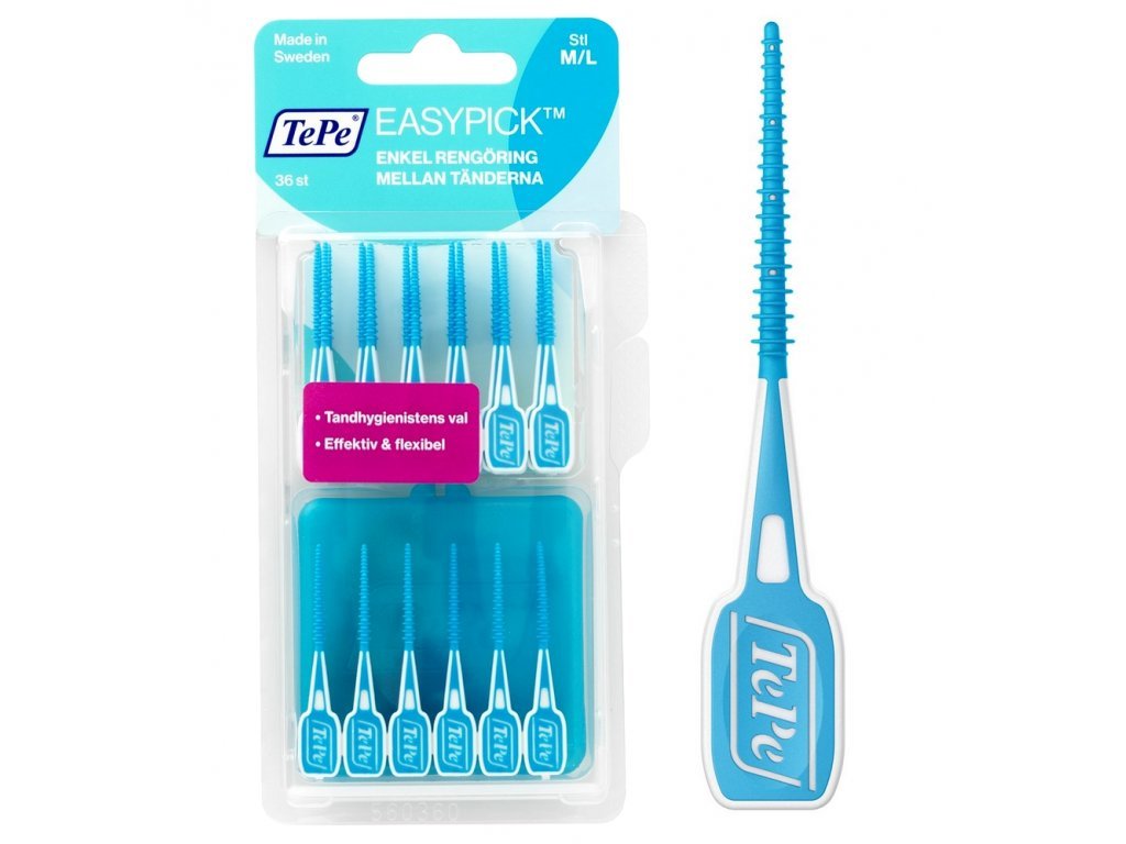 TePe EasyPick M/L je kombinace párátka a mezizubního kartáčku. Pevné a flexibilní jádro má silikonový povlak pro jemné čištění mezizubních prostor. Komfortní protiskluzová rukojeť zajišťuje stabilní čištění. TePe EasyPick neobsahuje latex. Je vhodný pro středně velké, velké mezizubní prostory. Balení obsahuje 36 ks a praktické cestovní pouzdro.
