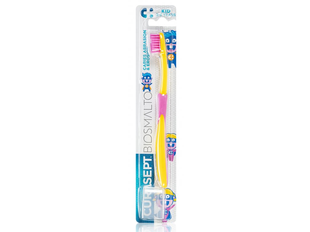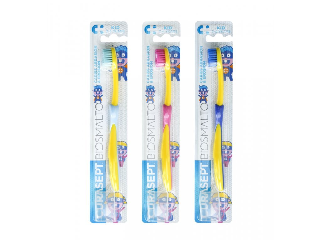 CURASEPT Biosmalto Kid je dětský zubní kartáček s malou oválnou hlavu na jedné straně lehce zúženou, osázenou velkým množstvím hustě uspořádaných extra měkkých vláken pro jemné a šetrné čistění dětských zoubků, bílé štětiny označují doporučené množství zubní pasty. Díky tvarované a pogumované rukojeti s oporou na palec se pohodlně drží a zabraňuje použití nadměrného tlaku. Sklon hlavice lze jednoduše přizpůsobit individuálním potřebám, stačí kartáček nahřát pod teplou tekoucí vodou a následně krček ohnout do požadované polohy.