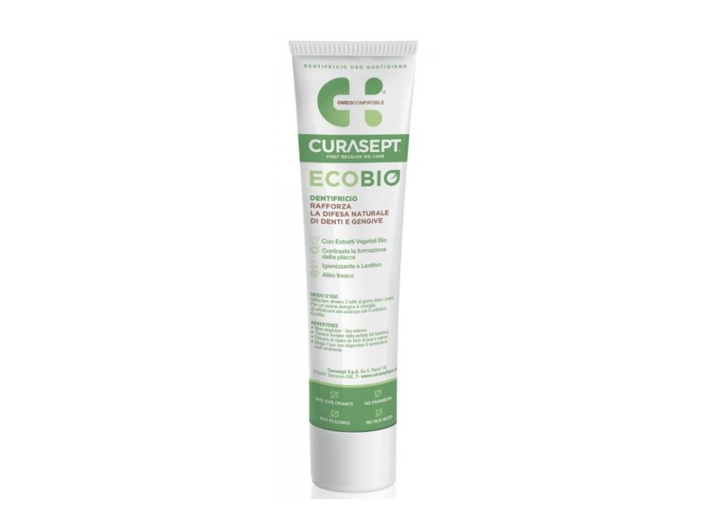 Zubní pasta CURASEPT ECOBio je složena z čistě přírodních extraktů z certifikovaného ekologického zemědělství. Posiluje přirozený obranný systém zubů a dásní aniž by došlo k napadení sliznice a zubní skloviny. Neobsahuje mentol ani fluorid, díky čemuž je vhodná při homeopatické léčbě, SLS a SLES ani barviva, čímž chrání sliznici před rizikem podráždění a alergií. Přítomnost Xylitolu má pozitivní vliv na pH v ústech, které je méně kyselé a tím pádem bezpečnější pro zubní sklovinu, Glycerofosfát vápenatý chrání sklovinu před demineralizací.